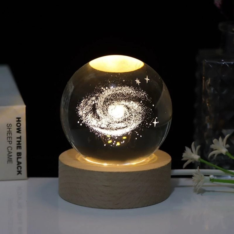 چراغ خواب گوی کریستال طرح کهکشان سایز 8 با پایه چوبی
