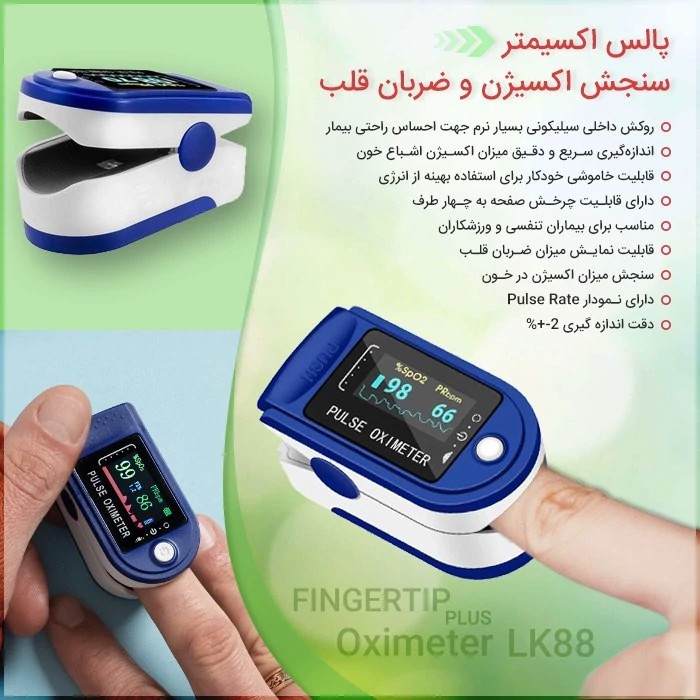 این محصول دارای بند آویز گردنی بوده و با دو باطری نیم قلمی کار می کند. پالس اکسیمتر انگشتی مدل LK88 میزان ضربان قلب و میزان اکسیژن محلول در خون (که حالت نرمال آن بین 95 تا 97 درصد هست) و البته میزان فسفات خون (PI) را با دو رنگ آبی و زرد نمایش می دهد. محدوده محاسبه و نمایش اکسیژن محلول در خون یا SpO2 در این دستگاه از %70 تا %100 و البته محدوده محاسبه ضربان قلب از 25 تا 250 ضربان در دقیقه می باشد. این محصول در صورت عدم استفاده (Finger Out)، پس از 8 ثانیه به صورت خودکار خاموش می شود. این محصول از صفحه نمایشگر چرخشی رنگی OLED با رزولوشن 0.96 اینچ و با ابعاد 128*64 پیکسل ساخته شده و از وضوح بالایی برخوردار است. به جهت خوانایی بهتر صفحه نمایش، با فشرده شدن دکمه سفید روی این محصول، صفحه نمایش در 4 حالت و به صورت چرخشی تغییر می یابد.
