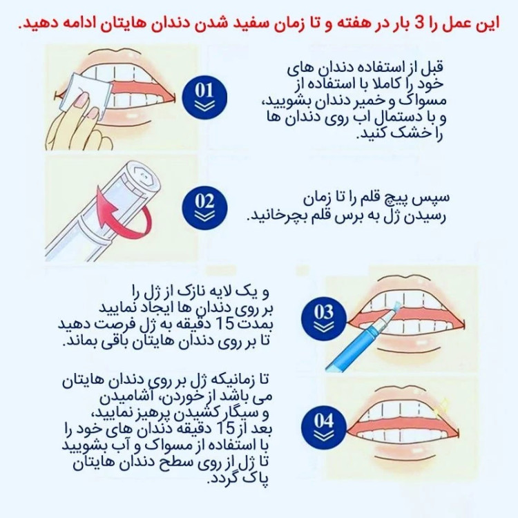 قبل از استفاده دندان های خود را کاملا با استفاده از مسواک و خمیر دندان بشویید، و با دستمال اب روی دندان ها را خشک کنید. سپس پیچ قلم را تا زمان رسیدن ژل به برس قلم بچرخانید و یک لایه نازک از ژل را بر روی دندان ها ایجاد نمایید. بمدت 15 دقیقه به ژل فرصت دهید تا بر روی دندان هایتان باقی بماند، تا زمانیکه ژل بر روی دندان هایتان می باشد از خوردن، آشامیدن و سیگار کشیدن پرهیز نمایید، بعد از 15 دقیقه دندان های خود را با استفاده از مسواک و آب بشویید تا ژل از روی سطح دندان هایتان پاک گردد، تا 2 ساعت بعد از استفاده از ژل از مصرف چای، قهوه، مواد کافئین دار، سیگار و قلیان اکیدا خودداری نمایید، این عمل را 3 بار در هفته و تا زمان اتمام محصول ادامه دهید، نتیجه اصلی بعد از اتمام یک دوره مشاهده خواهد شد. دقت نمایید این محصول برای افرادی که دارای دندان کامپوزیت یا لمینت هستند کارایی ندارد.