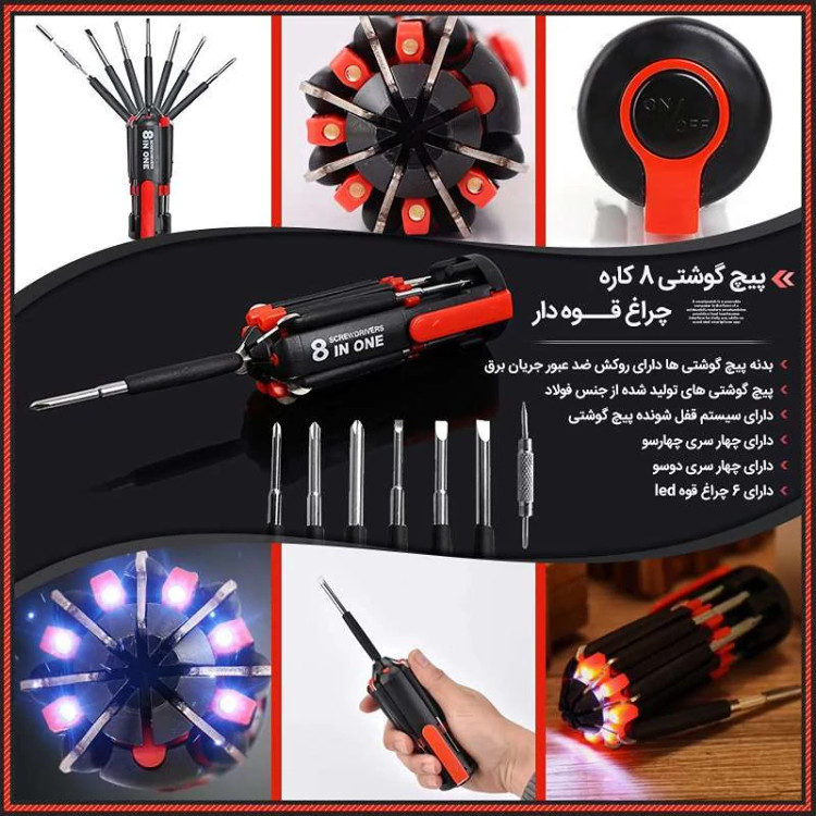 پیچ گوشتی 8 کاره چراغ قوه دار