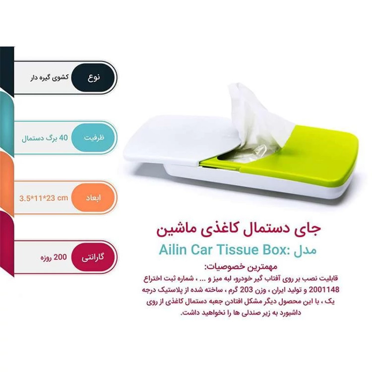 جا دستمال کاغذی ماشین محصولی با طراحی نوین و بسیار کاربردی که می توان گفت بزرگترین ویژگی آن، امکان به کارگیری فضای غیر قابل استفاده درون ماشین و همچنین ثابت ماندن جا دستمال کاغذی در حین حرکت ماشین و تکان های ناشی از آن می باشد.در قسمت پشت جا دستمال کاغذی، گیره ای تعبیه شده که به شما امکان نصب آن را بر روی سایه بان ماشین (آفتابگیر) را می دهد و نیازی به اشغال فضای زیاد داخل ماشین ندارد. جا دستمال کاغذی ماشین از جنس پلاستیک مرغوب تهیه گردیده و درب آن نیز به صورت کشویی باز و بسته می شود که شما بعد از هر بار استفاده می توانید درب آن را ببندید.