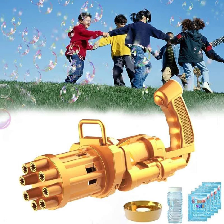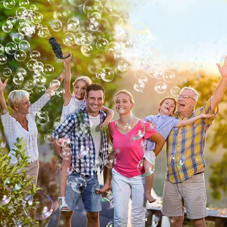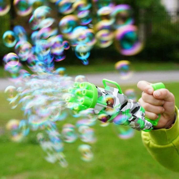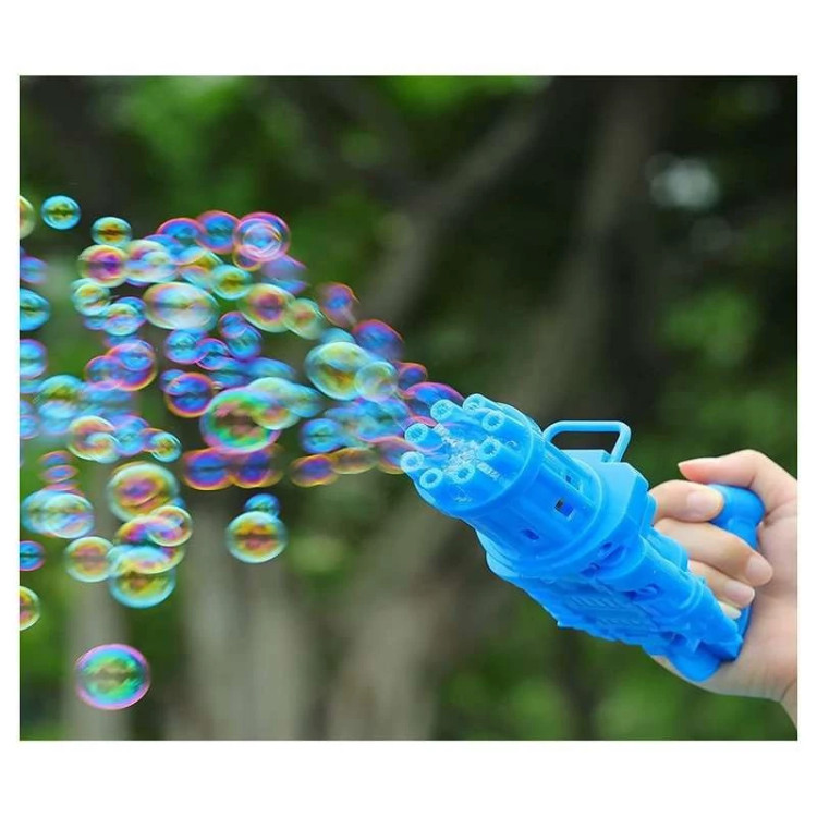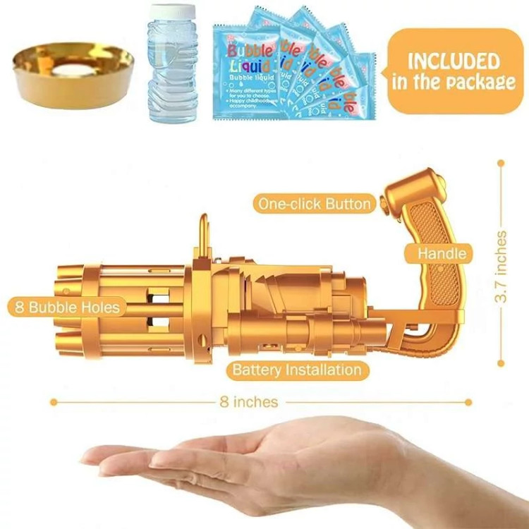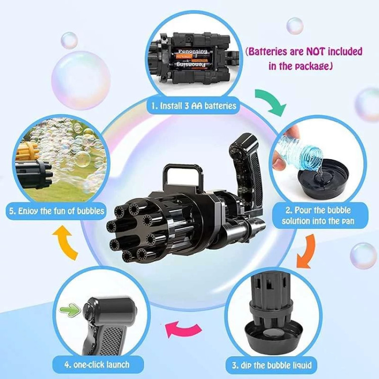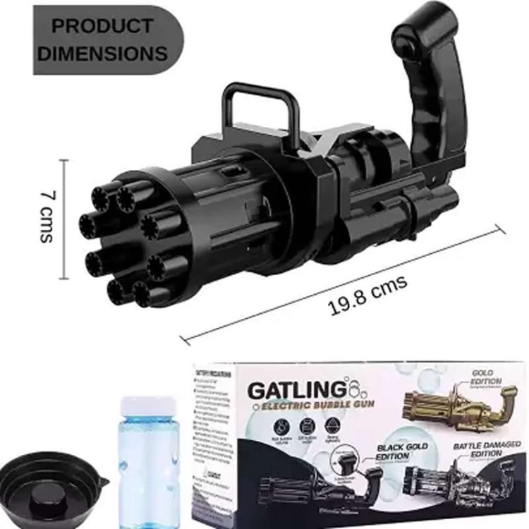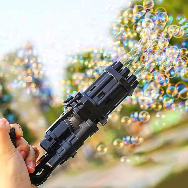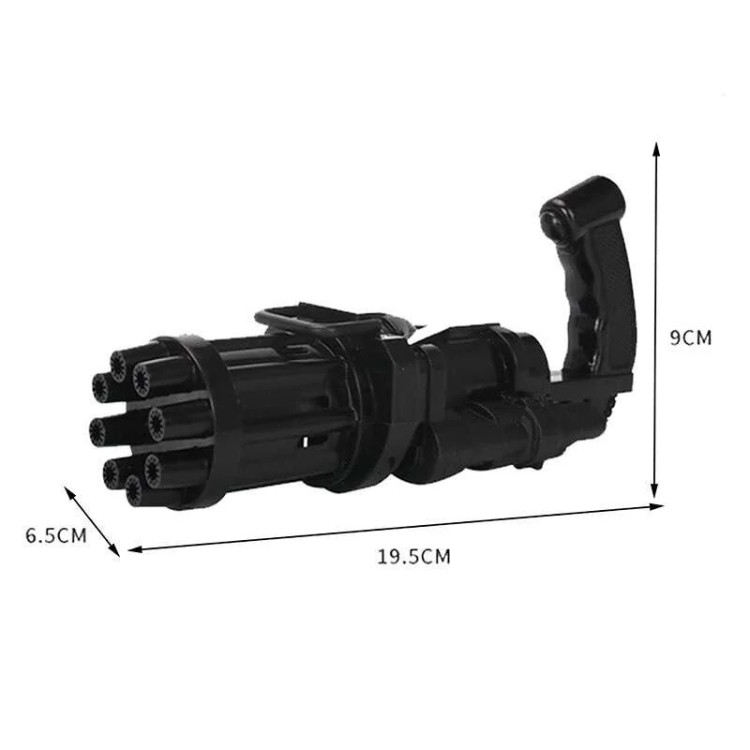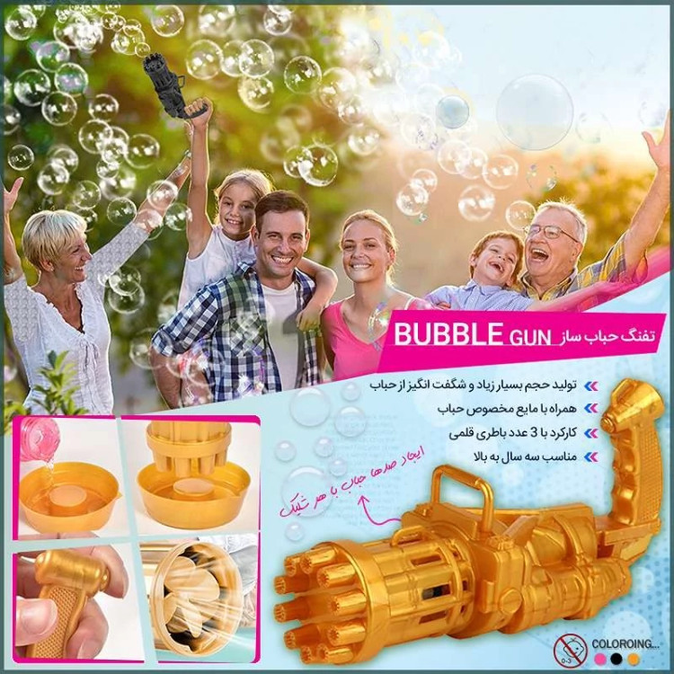 تفنگ الکتریکی حباب ساز BUBBLE GUN دارای 8 سوراخ است که می تواند صد ها حباب را در دقیقه در هوا پراکنده کند. تفنگ حباب ساز باتری خور بوده و با سه عدد باتری قلمی کار میکند. جنس بدنه این محصول از پلاستیک غیر سمی ساخته شده و از مقاومت خوبی برخوردار است. طراحی ابتکاری و جدید این مسلسل حباب ساز نیاز کودکان به تفریح را برآورده می کند و توجه آنها را به خود جلب می نماید. این دستگاه حباب ساز بهترین گزینه برای وقت گذراندن والدین با فرزندانشان می باشد و روابط عاطفی بین آنها را تقویت می کند. دستگاه حباب ساز موجود برای فعالیت های داخل و خارج از منزل مناسب است. طراحی جالب و منحصر به فرد اسلحه Gatling باعث توسعه ی تخیل و خلاقیت کودکان می شود و می تواند به عنوان هدیه برای کودکان سه سال به بالا استفاده شود. به علت ساختار محکم این محصول مایع به هیچ عنوان نشت نمی کند. سرعت پخش حباب نیز بسیار روان است و گیر نمی کند. برای کودکان بسیار راحت است که آن را با یک دست نگه دارند. رنگ حباب روشن است و بی بو است و البته بعد اتمام مایع این محصول خودتان هم می توانید به آسانی مایع حباب را با استفاده از آب و صابون مایع تولید کنید.