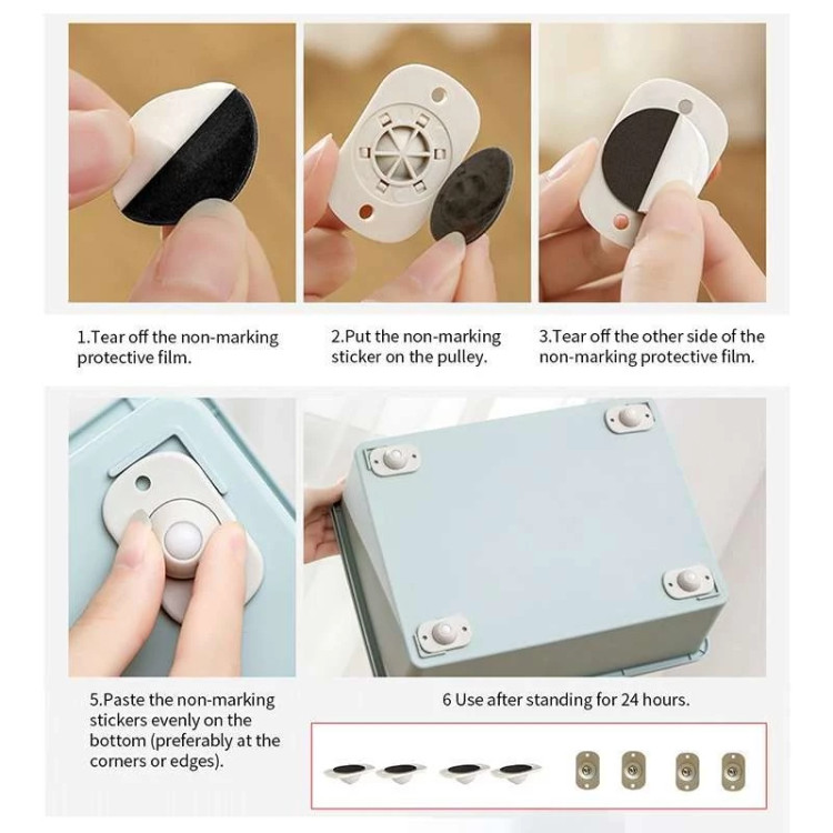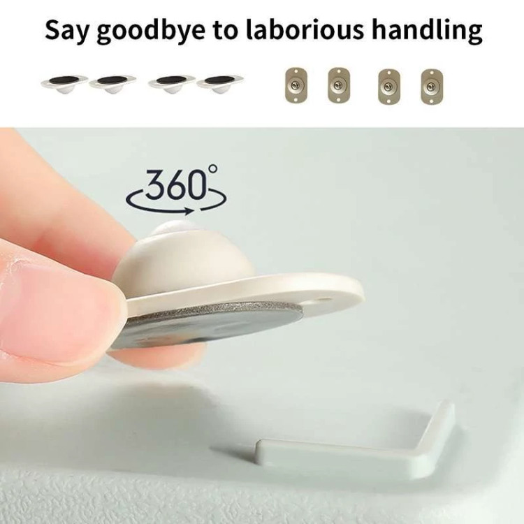 شامل 4 چرخ و 4 چسب دو طرفه مخصوص قابل فیکس شدن با چسب 2 طرفه و پیچ تحمل وزن هر چرخ 8 تا 10 کیلو همیشه یکی از پردردسر ترین کارها در مواقع نظافت و خانه تکانی یا تغییر دکوراسیون منزل جابجایی اجسام مانند پا تختی ، کیس کامپیوتر و … است، که باید یک نفر نیروی کمکی همراه شما باشد تا بتوانید به کمک یکدیگر این لوازم را جابجا کنید و نظافت کنید. اما با محصول ویژه و بسیار کاربردی که عرضه کرده ایم این کار نیز به راحتی آب خوردن، قابل انجام خواهد بود و از این به بعد می توانید به تنهایی و بدون کمک، تمام کارهای حمل و جابجایی لوازم منزل و نظافت را انجام دهید! یک محصول خلاقانه کاربردی دیگر برای زندگی راحت تر! این محصول وارداتی و بسیار با کیفیت می باشد و جنس بدنه پلاستیک و جنس چرخ فلزی ضد زنگ بوده که با چسب دوطرفه قابلیت محکم شدن در جای خود را دارد، همچنین جای دو سوراخ پیچ تعبیه شده که بتوانید با پیچ در جای خود محکم کنید. هر چرخ قابلیت تحمل 8 الی 10 کیلو وزن را دارد و با توجه به اینکه در هر بسته 4 چرخ وجود دارد مجموع بسته ارسالی قابلیت تحمل وزنی حدود 40 کیلوگرم را دارد و شما با اتصال کردن این چرخ ها به وسیله خود به راحتی هر چه تمام می توانید آنها را جابه جا کنید.