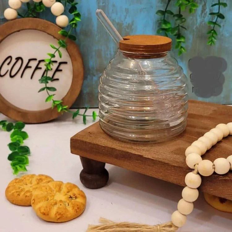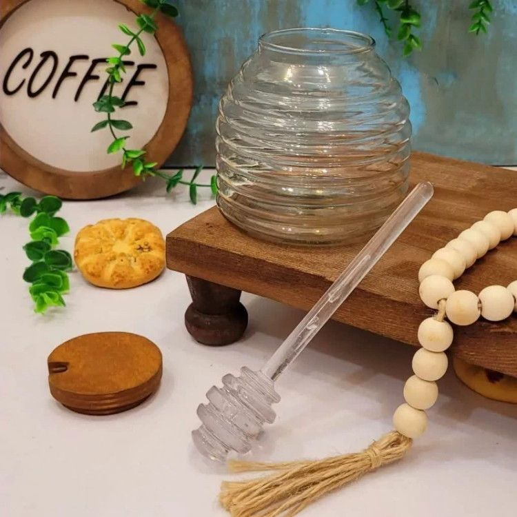 عسل خوری شیشه ای کندو درب چوبی به همراه قاشق