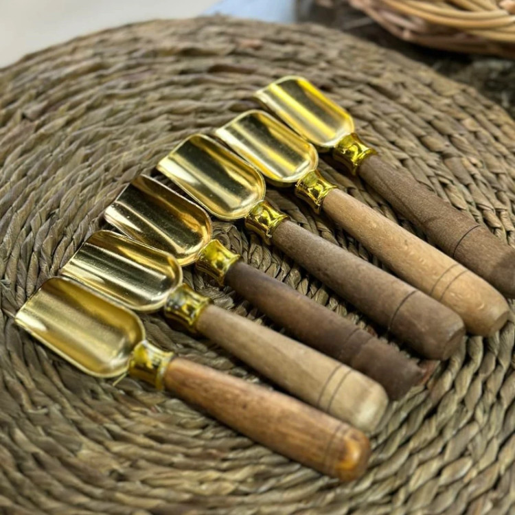قاشق ادویه دسته چوبی مدل سر تاس تیغه رنگ طلایی