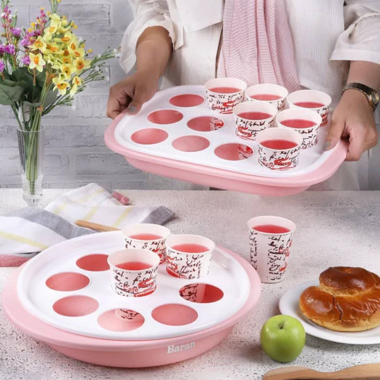 این سینی کاملا از مواد پلاستیکی اولیه نو ساخته شده و همچنین با طراحی که دارد مانع از چپه شدن لیوان ها میشود .
