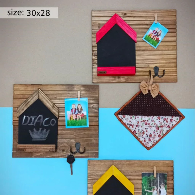 تخته سیاه چوبی طرح کلبه به همراه آویز عکس و قلاب دار