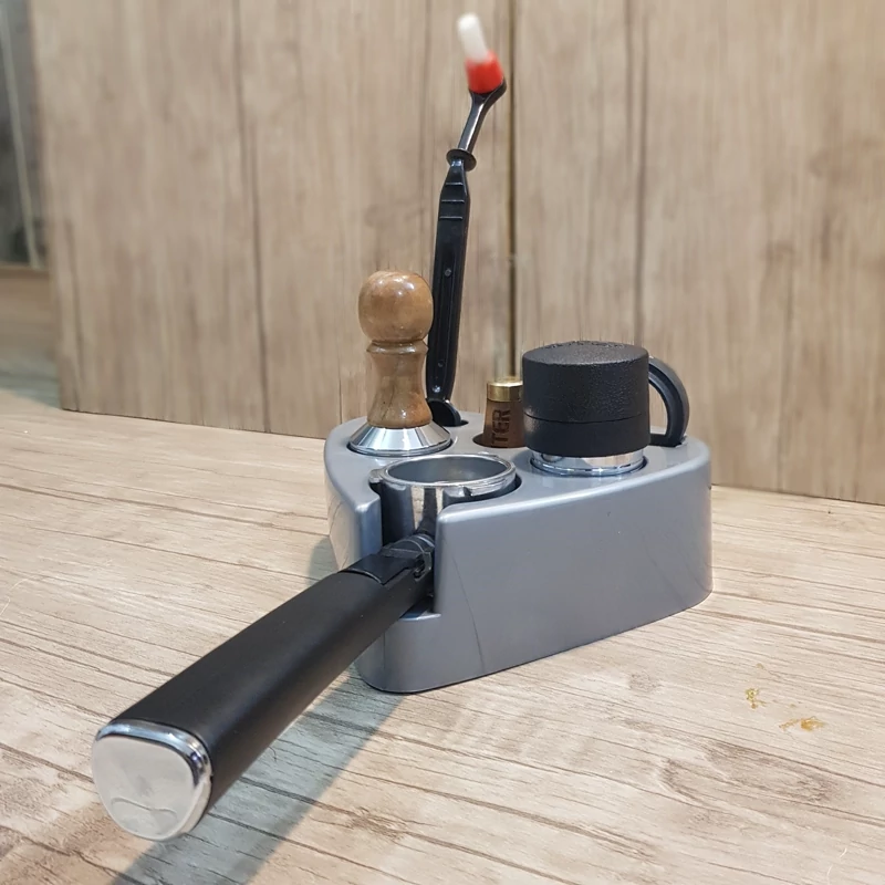 استند قهوه ساز (رنگ طوسی یا نقره ای)شامل جایگاه دسته دستگاه،نیدل،فانل ،فرچه،پاک اسکرین ،لولر ،تمپر و غیره میباشد که علاوه بر کاربردی بودن به شدت زیبا و شکیل میباشد