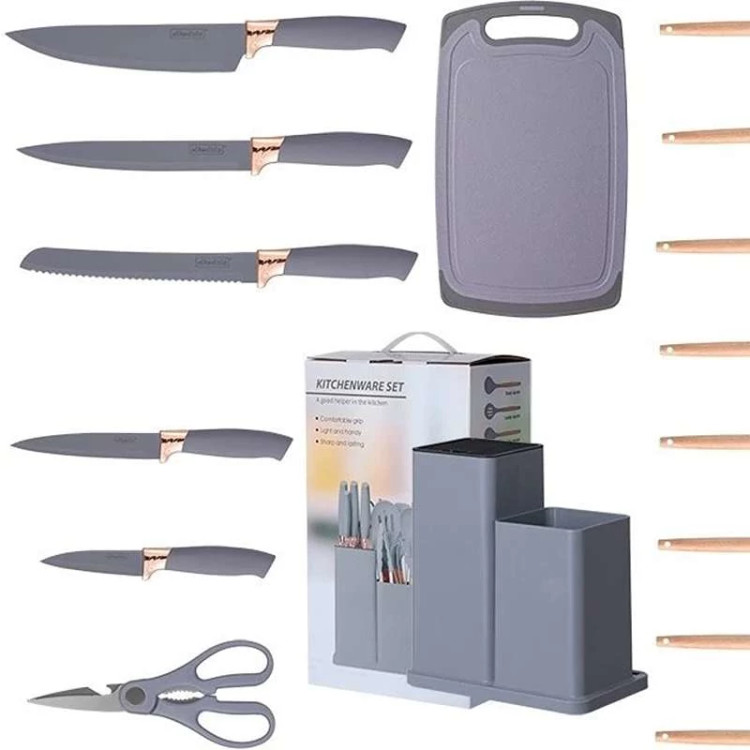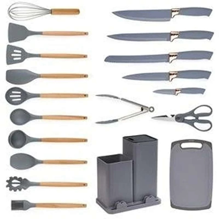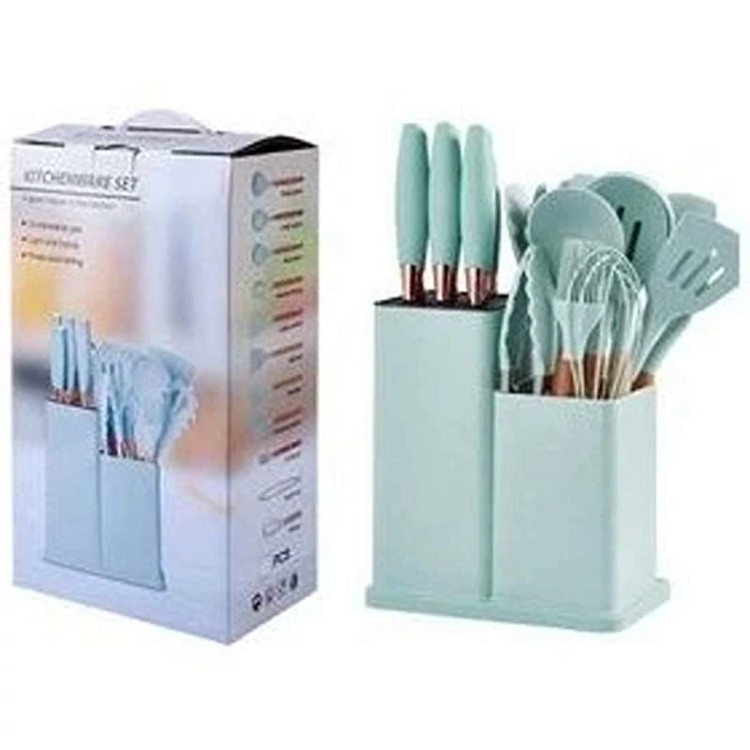رنگ صورتی مشکی خاکستری و سبز جنس بدنه بامبو و سیلیکون و تیغه فولاد با رنگ سرامیکی قابلیت شستوشو با دست با ماشین ظرفشویی امکانات ظاهری پایه شامل کفگیر برنج کفگیر پختوپز ملاقه همزن انبر پایه (استند) ابزار آشپزی چاقو نگهدارنده چاقو سرویس کفگیر و ملاقه تخته گوشت کفگیر سرو لازانیا انبر سالاد