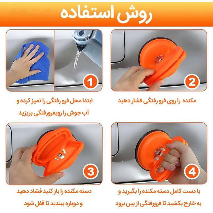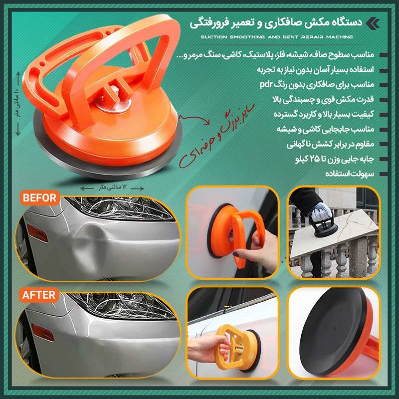 دستگاه مکش صافکاری PDR و تعمیر فرورفتگی مناسب سطوح صاف، شیشه، فلز، پلاستیک، کاشی، سنگ مرمر و... استفاده بسیار آسان بدون نیاز به تجربه مناسب برای صافکاری بدون رنگ PDR سایز بزرگ و اورجینال مخصوص PDR خودرو دستگاه مکش صافکاری و تعمیر فرورفتگی یک ابزار حرفهای و کارآمد برای صافکاری بدنه خودرو است که بهویژه برای رفع دفرمگیها و مشکلات بدنه خودروها طراحی شده است. این قاپک صافکاری با اندازه 12 میلیمتر و طراحی دقیق، امکان استفاده راحت و مؤثر را برای تعمیرکاران فراهم میآورد. کیفیت بالای ساخت این ابزار باعث میشود که بتوان از آن در شرایط مختلف صافکاری استفاده کرد. دستگاه مکش صافکاری و تعمیر فرورفتگی بهطور خاص برای استفاده در تعمیرات بدنه خودروهایی که نیاز به اصلاح و صاف کردن دارند، طراحی شده است. این ابزار با قابلیتهای ویژه خود، موجب بهبود سرعت و دقت فرآیند صافکاری میشود و برای کسانی که به دنبال یک ابزار حرفهای هستند، انتخابی مناسب است. ساختار مقاوم و بادوام: دستگاه مکش صافکاری و تعمیر فرورفتگی از مواد با کیفیت ساخته شده است تا مقاومت و دوام بالایی در برابر فشار و ضربه داشته باشد. اندازه مناسب: اندازه 12 میلیمتری این قاپک باعث میشود که ابزار برای کارهای دقیق و ظریف صافکاری مناسب باشد. طراحی ارگونومیک: طراحی خاص و ارگونومیک این ابزار، راحتی در استفاده و کنترل بیشتر را برای کاربران فراهم میکند. استفاده آسان: دستگاه مکش صافکاری و تعمیر فرورفتگی بهراحتی قابل استفاده است و میتوان آن را در انواع کارگاههای تعمیرات خودرو به کار برد. افزایش دقت و سرعت: با استفاده از این قاپک، فرآیند صافکاری با دقت و سرعت بالاتری انجام میشود و میتواند موجب صرفهجویی در زمان شود. مقاومت در برابر ضربه: این ابزار بهدلیل ساختار مقاوم خود، در برابر ضربات و فشارهای زیاد مقاوم است و برای استفاده طولانیمدت مناسب میباشد. آسان برای استفاده: طراحی ارگونومیک این قاپک صافکاری، استفاده از آن را حتی برای کاربران غیرحرفهای نیز ساده میکند. صافکاری بدنه خودرو: این قاپک برای صافکاری قسمتهای مختلف بدنه خودرو و رفع دفرمگیهای جزئی و کلی طراحی شده است. تعمیرات خودروهای سنگین: از این قاپک میتوان در تعمیرات بدنه خودروهای سنگین مانند کامیونها و اتوبوسها استفاده کرد. کارگاههای صافکاری: این ابزار برای استفاده در کارگاههای صافکاری و تعمیرات خودروهای مختلف طراحی شده است. نکته مهم: این محصول سایز بزرگ و حرفه ای این کالا می باشد و با نمونه قدیمی و کوچک این کالا بسیار متفاوت است.
