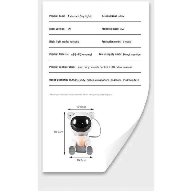 دارای 4 رنگ آبی سفید قرمز و سبز با قابلیت ترکیب آنها و تولید ۸ رنگ دارای روشنایی ماه در دست به عنوان شبخواب دارای تایمر جهت خاموش شدن خودکار دارای ریموت کنترل دارای دکمه های تنظیم صدا و شدت نور دارای قابلیت پخش نور بصورت لیزر و کنترل شدت آن انواع نور شب فضای پرستاره با چرخش 360 درجه قدرت led کمتر از 5 وات جریان ورودی 5 ولت و یک آمپر
