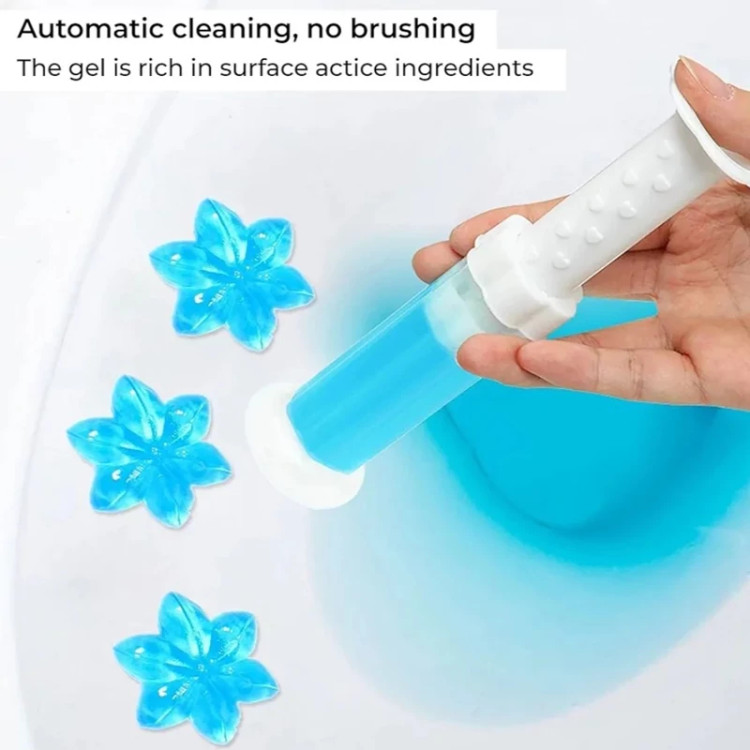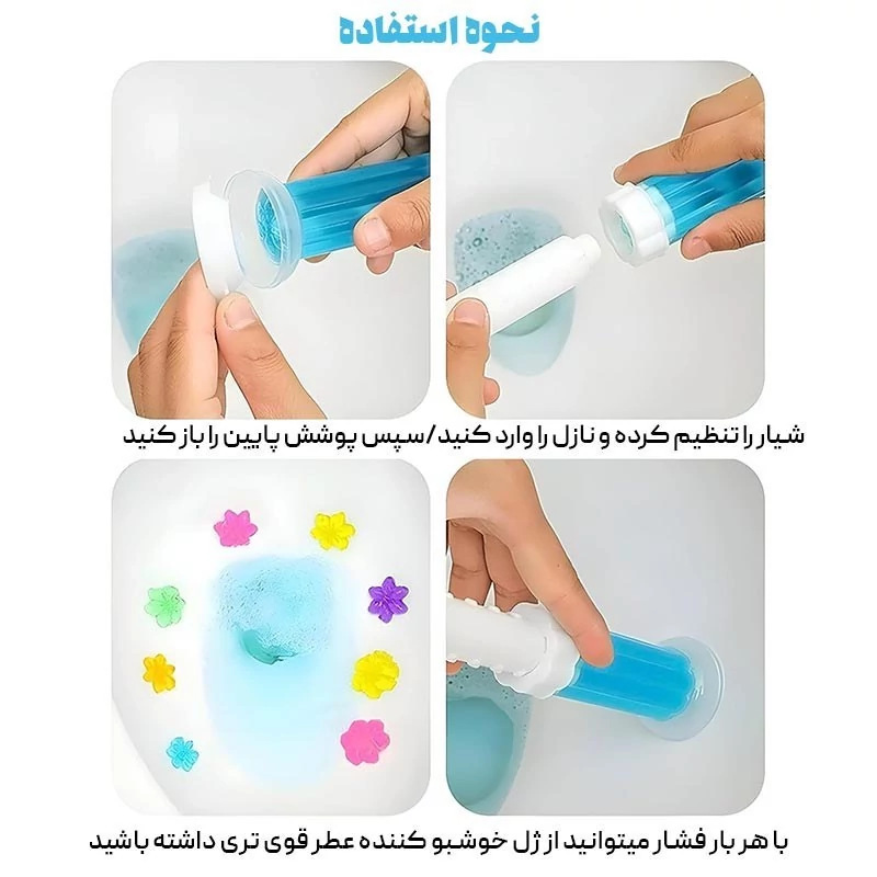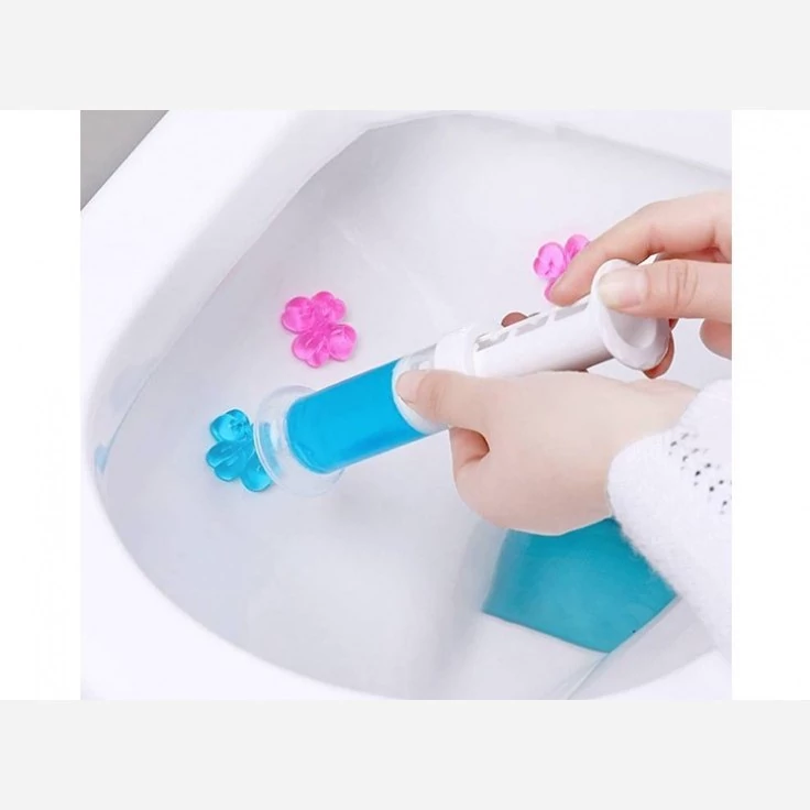 علاوه بر از بین بردن باکتری، لکه زدا و خوشبوکننده هم هست که در 6 رایحه ارائه شده. این محصول مدل سرنگی و مخصوص توالت فرنگی است. این بوگیر برای مدت طولانی به سطح توالت می چسبد و می توانید بدون تعویض مکرر از توالت فرنگی استفاده کنید، فقط کافیه هفتهای یک عدد گل به دیوارهی توالت فرنگی بزنید. 14 شیار روی سرنگ مشخص شده که به اندازه مصرف 14 هفته است.